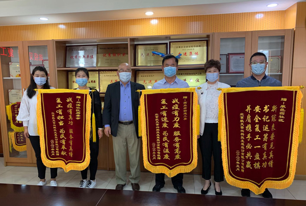 2020年5月12日,北京航天常兴科技发展股份有限公司董事长杨迺文、总经理王德坤及董事会秘书赵琳向高米店街道工委、兴涛社区居委会、康邑园社区登门拜访并赠送三面锦旗。