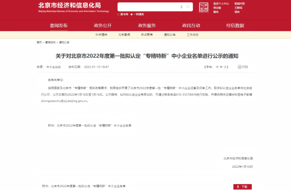 近日,北京市经济和信息化局正式公布了2022年度第一批“专精特新”中小企业名单。