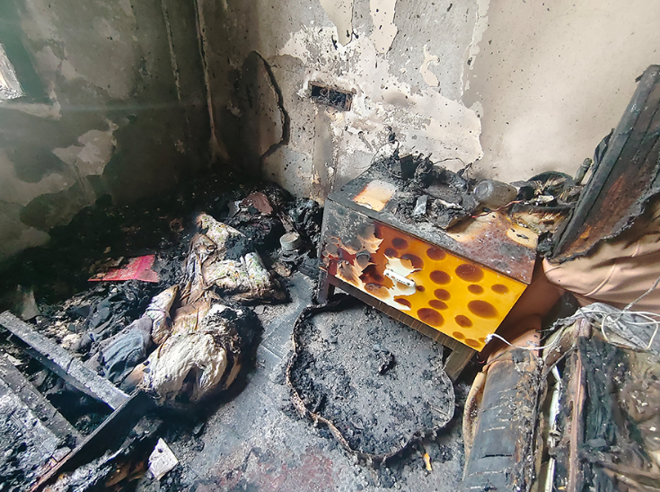 电蚊香的正下方,放置有一个收纳盒、一床棉被、衣物。发生火灾的当晚家中无人,共造成卧室沙发、床及空调等被烧毁,客厅及餐厅墙面均被浓烟熏黑。