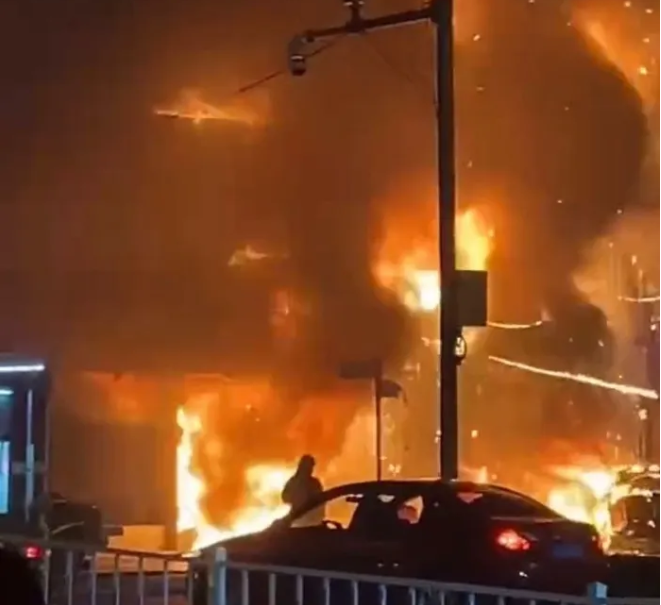 事故现场火势猛烈,伴有大量浓烟,不仅殃及餐厅本身,还导致楼下一辆车被烧毁,并波及邻近两家店铺。