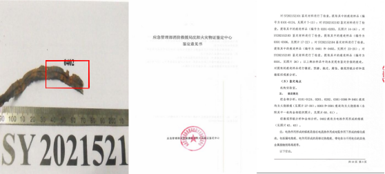 (1)起火点处提取到的灯具线路蛇皮金属管有烧蚀、击穿痕迹,并与电气线路金属线芯残骸黏连,经应急管理部消防救援局沈阳火灾物证鉴定中心鉴定,此处痕迹为电热作用形成的金属熔痕。
