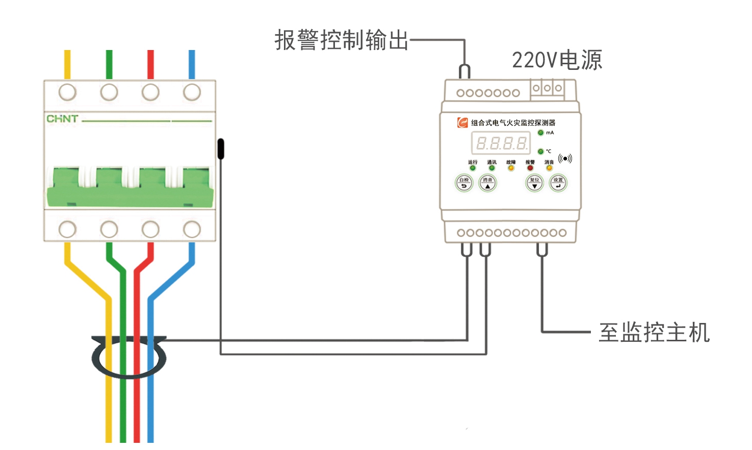 ●报警设定:100-999mA 、温度60℃ ●报警输出:无源触点(AC220V5A)