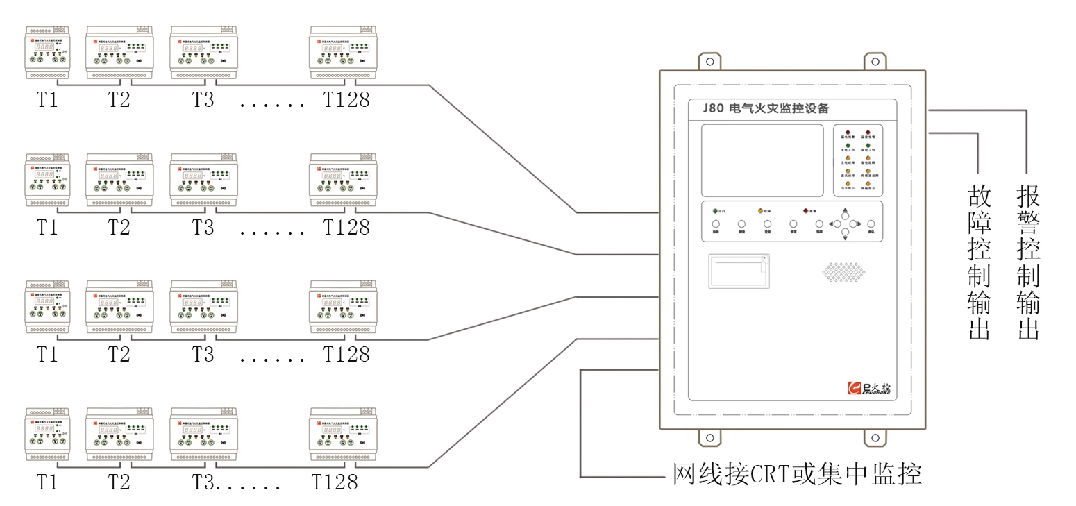 电气火灾监控系统主要采用联网监控方式,对多个监控主机进行统一的集中监控管理,并通过网络连接,用户方监控负责人可以随时查看接入集中监控系统的主机运行情况及所监测线路的剩余电流值(或温度值),在出现报警后能够尽快了解情况,做出正确的应急指挥,以便减少损失。同时 e 火控系列电气火灾监控设备 也可以接入智能数据传输单元,运行于云平台大数据业务,实时在指挥部及微信端了解到系统的全部工况。